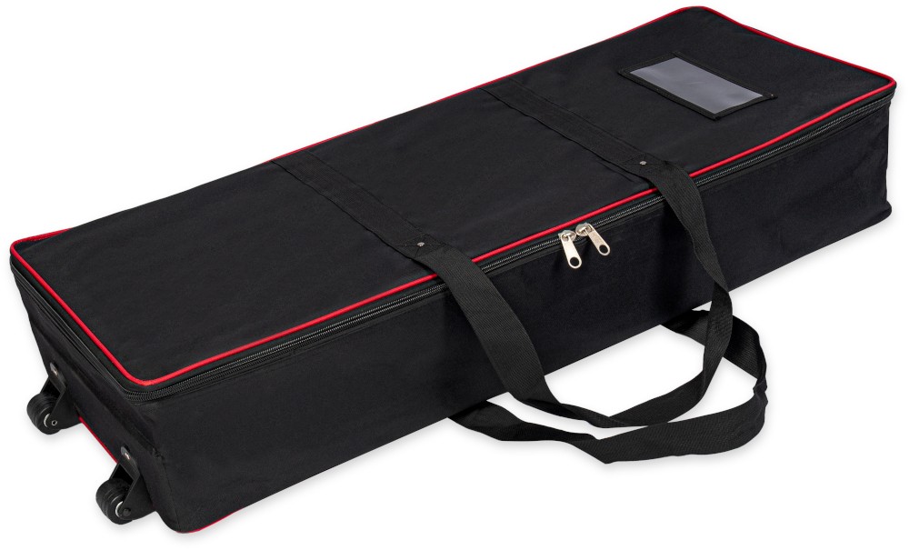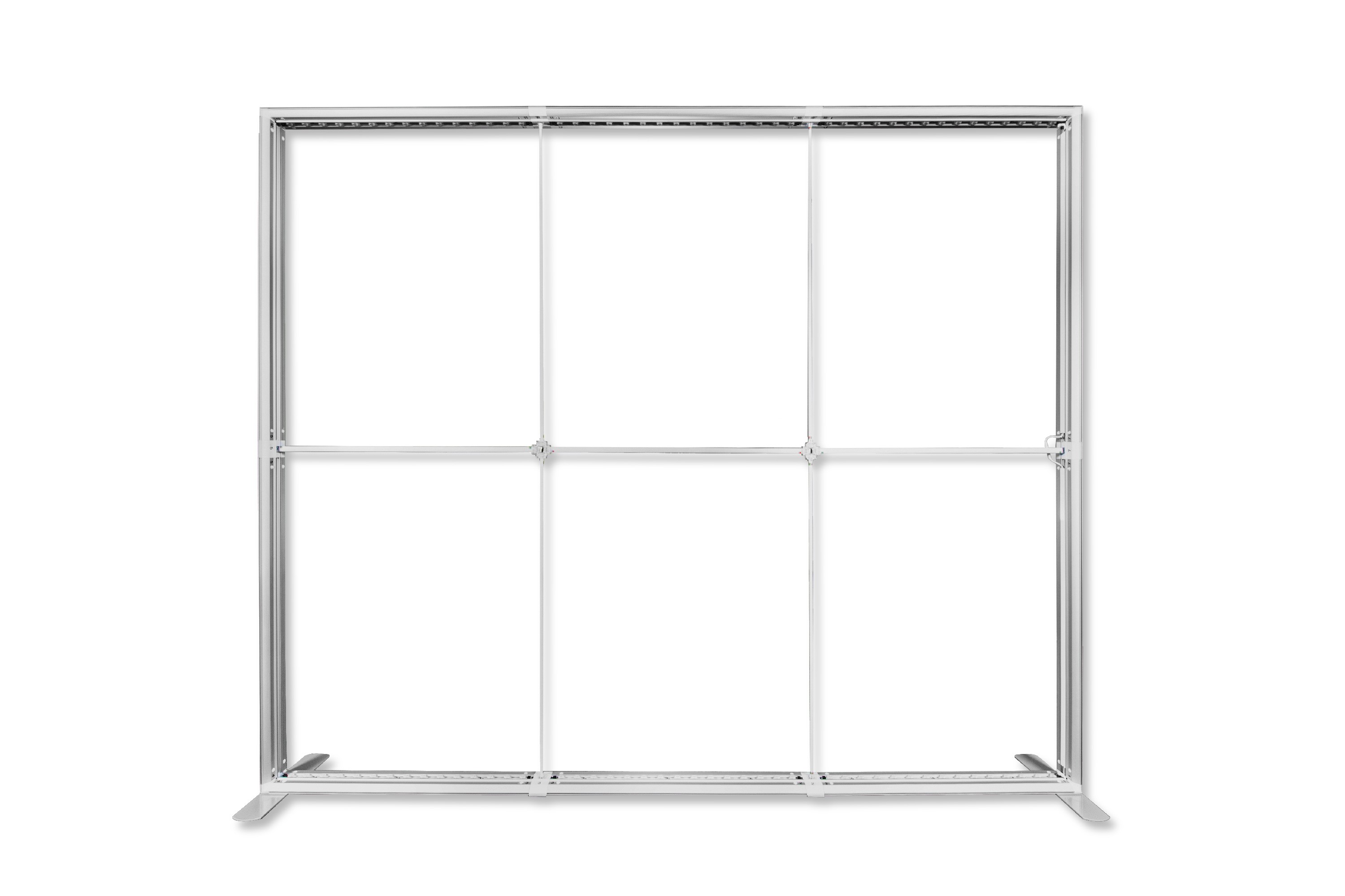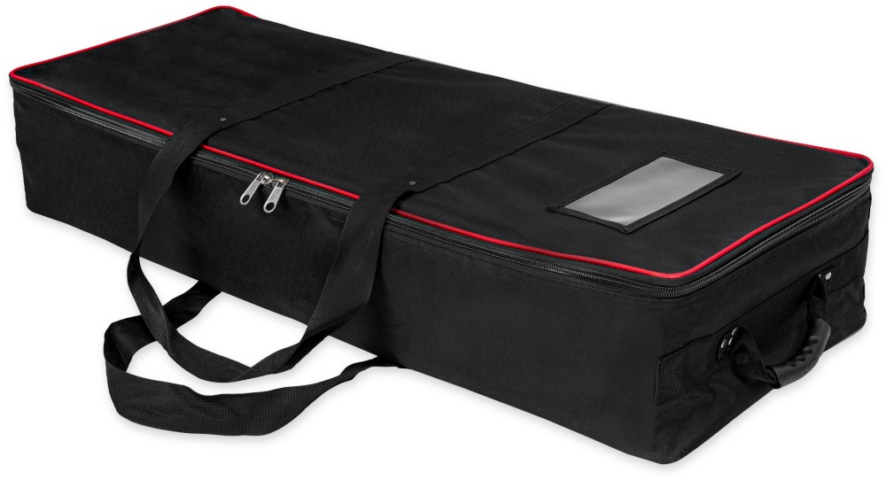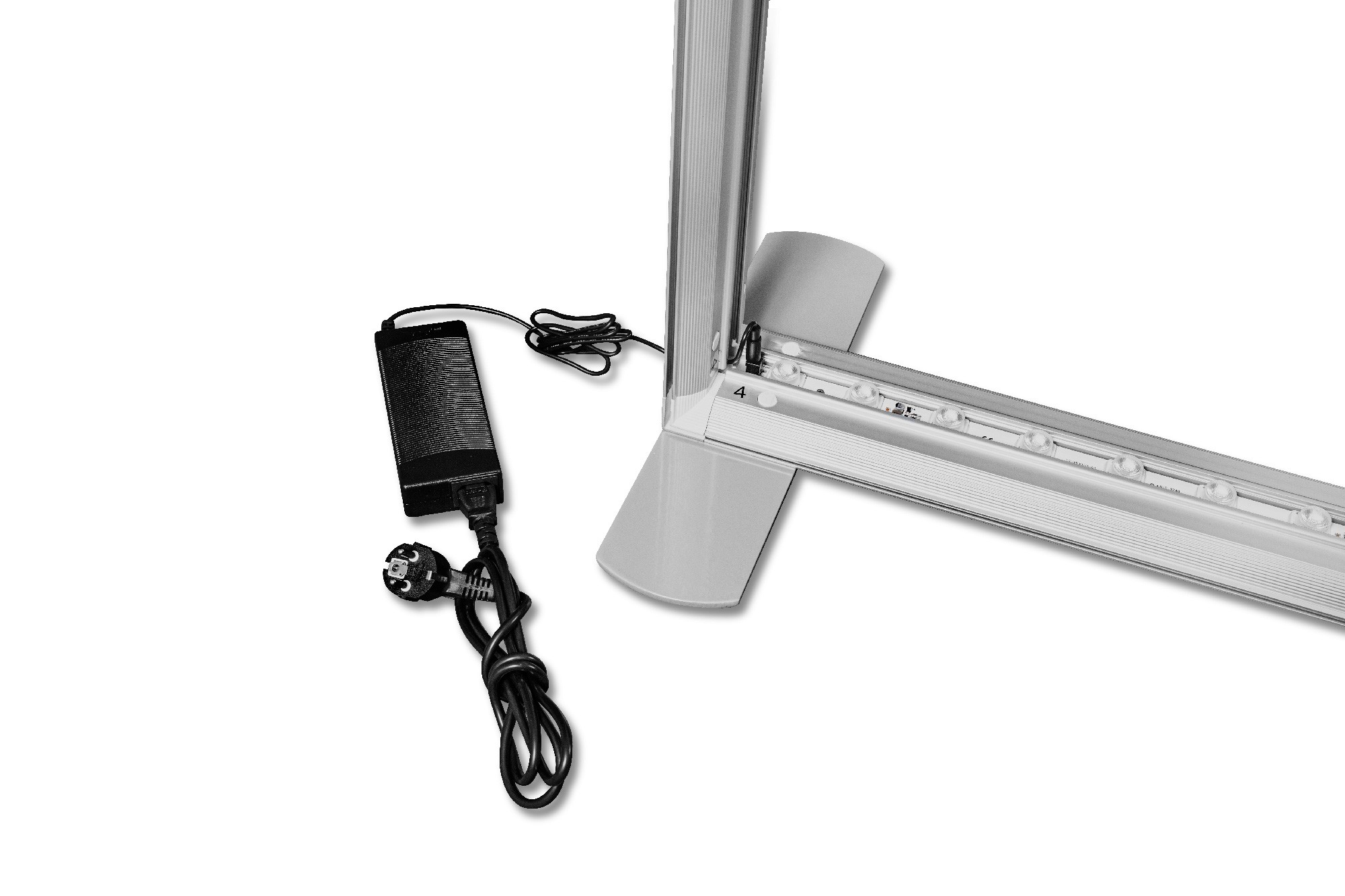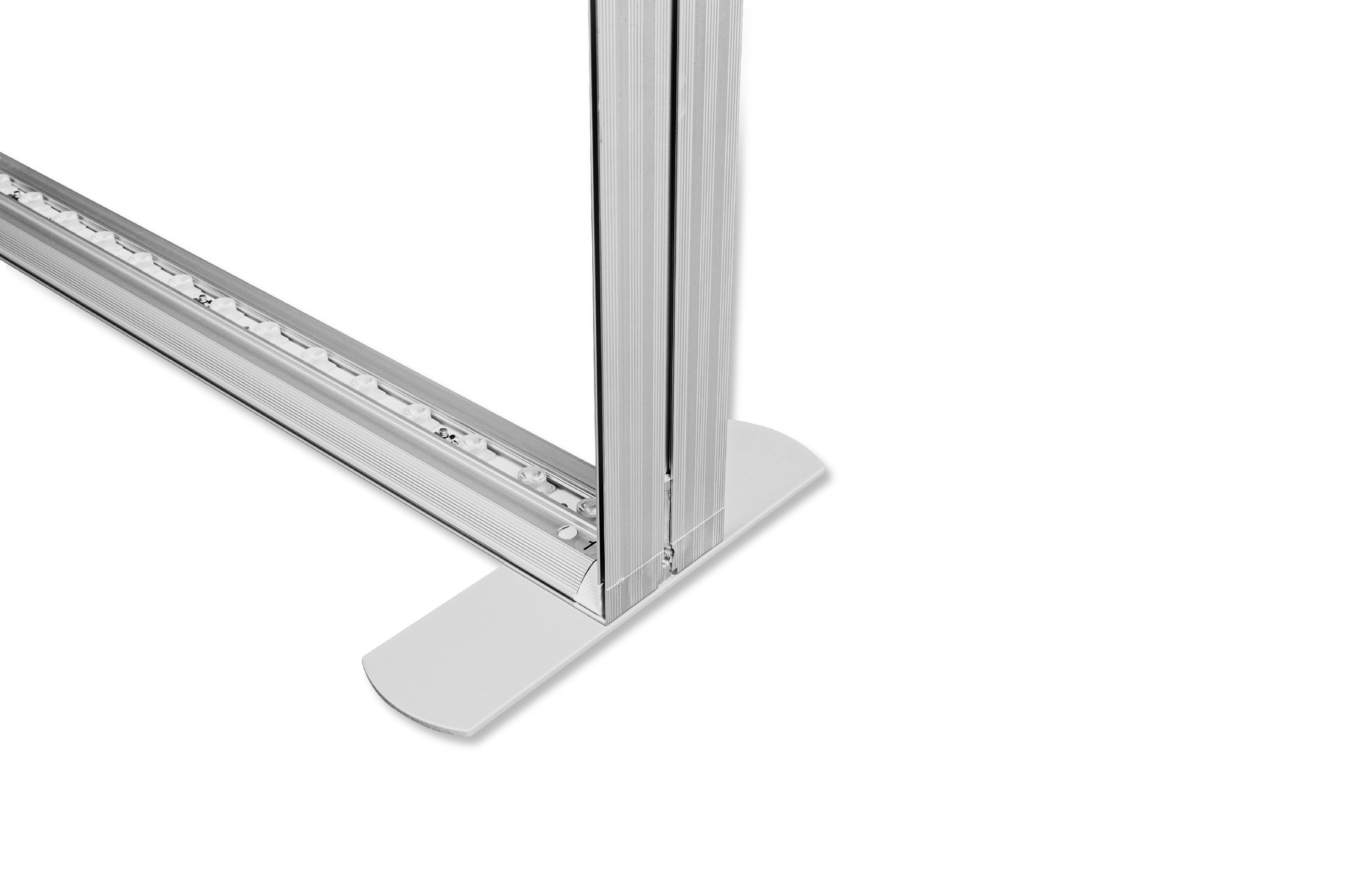 Nowoczesna ścianka reklamowa z podświetleniem krawędziowym diodami LED i wydrukiem na specjalnym materiale tekstylnym do podświetleń. Konstrukcja wykonana została z szerokich (12 cm) aluminiowych profili w kolorze srebrnym. Bardzo szybki montaż i demontaż odbywa się bez użycia narzędzi - poszczególne elementy mocowane są ze sobą na klik. Całość zapakowana została w solidną torbę na kółkach, co znacznie ułatwia przechowywanie i transport całego systemu - każdy element jest umieszczony w oddzielnej przegrodzie wypełnionej miękką pianką, co ułatwia transport i chroni przed uszkodzeniem.