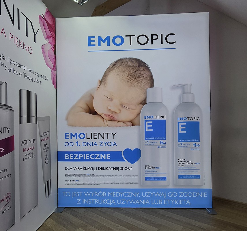 Lepsza widoczność – Podświetlenie przyciąga wzrok, dzięki czemu reklama staje się bardziej zauważalna, nawet w dużych i zatłoczonych przestrzeniach, takich jak targi czy galerie handlowe.